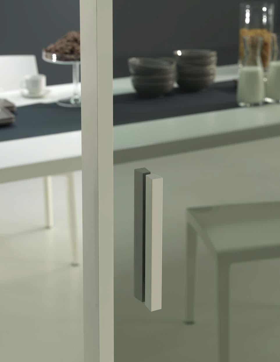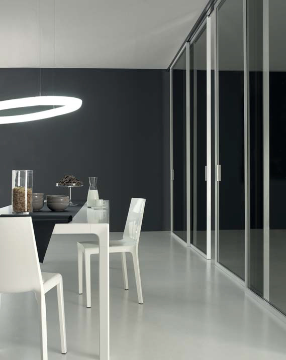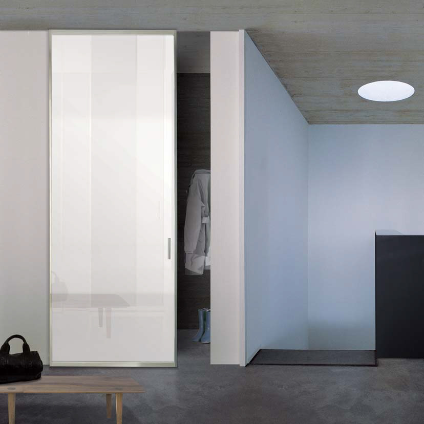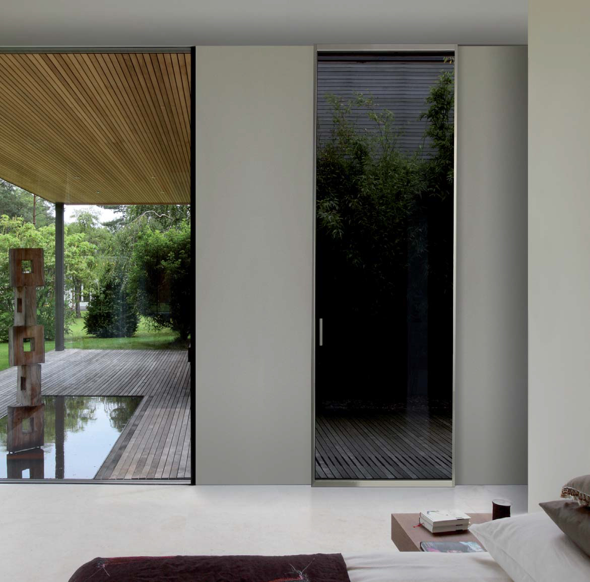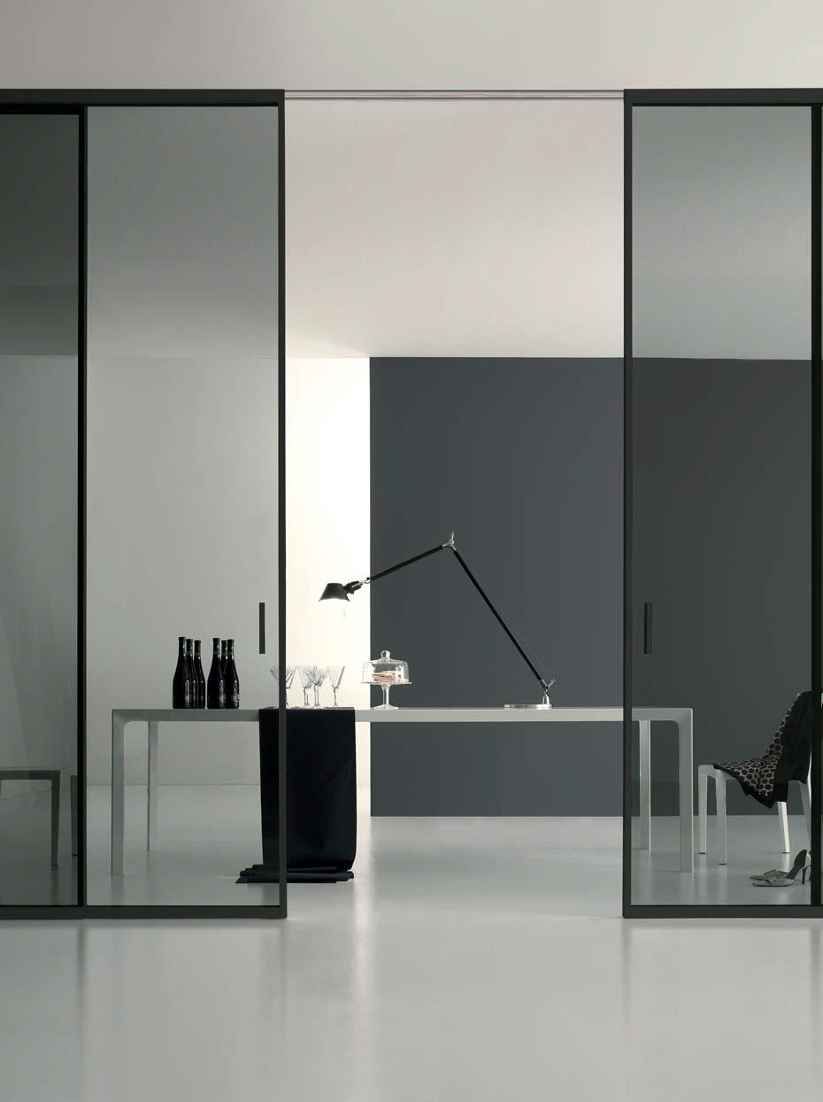 Une porte vitrée située au milieu d’un cadre mince en aluminium, qui se déplace sur un rail dissimulé/visible au plafond.